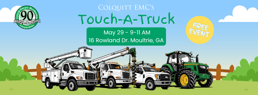 Join us at Colquitt EMC's Headquarters Office in Moultrie on May 29 for our first ever Touch-A-Truck Event.